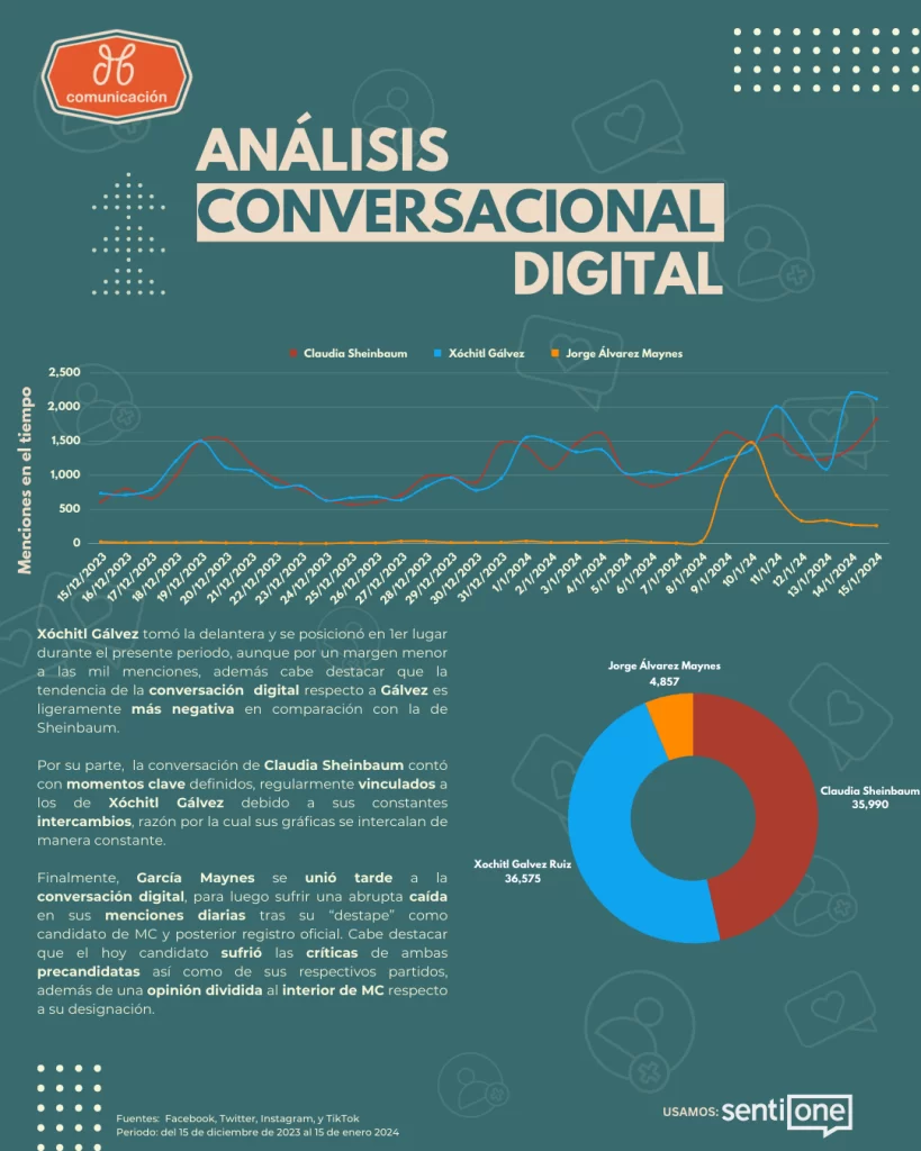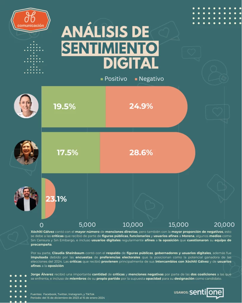 28.6% negativas, destacan encuestas que posicionan a Claudia Sheinbaum por arriba de Xóchitl Gálvez en preferencias electorales; notas de los medios Sin Censura y Sin Embargo donde critican a Xóchitl Gálvez; intercambios entre Xóchitl Gálvez y Claudia Sheinbaum, así como con otros miembros de Morena tales como Alejandro Armenta, AMLO y Tatiana Clouthier.